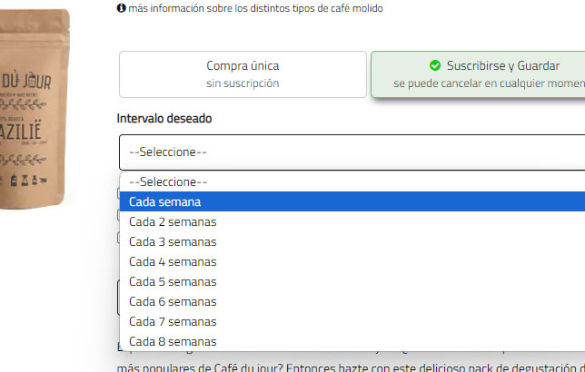 Al buscar un producto en el sitio, verás las opciones de envío y variantes bajo el título. Allí, encontrarás los botones 'compra única' o 'suscribirse con un 2% de descuento'. Al hacer clic en 'suscribirse ', aparecerán varias opciones para elegir el intervalo. En la imagen a continuación, puedes ver un ejemplo de cómo completar tu suscripción de café.